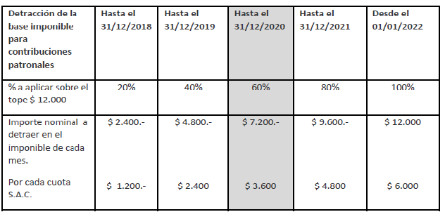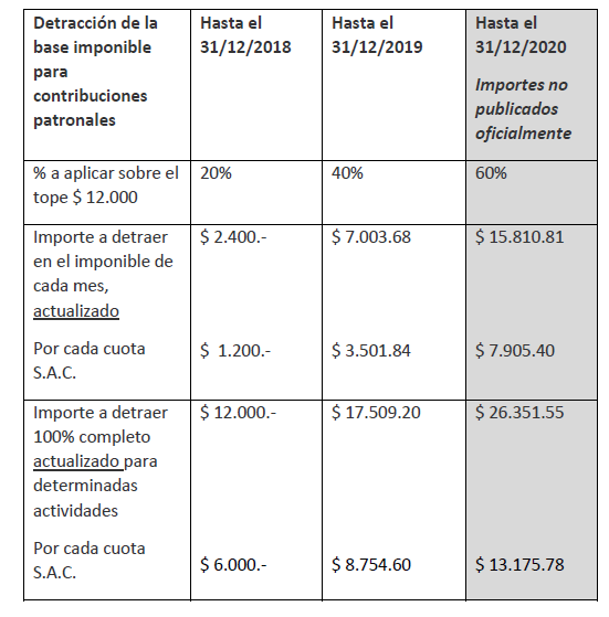 1- Contribuciones patronales de la Seguridad Social. Detracción de la base imponible en el importe de $ 12.000.- por empleado, en forma gradual.
